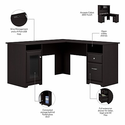 45+ Bush Cabot L Shaped Desk US. Work in style with the bush furniture cabot l shaped desk with hutch and 5 shelf bookcase. Desk storage details include an enclosed cabinet with stylish fluted glass door and a box drawer for supplies.